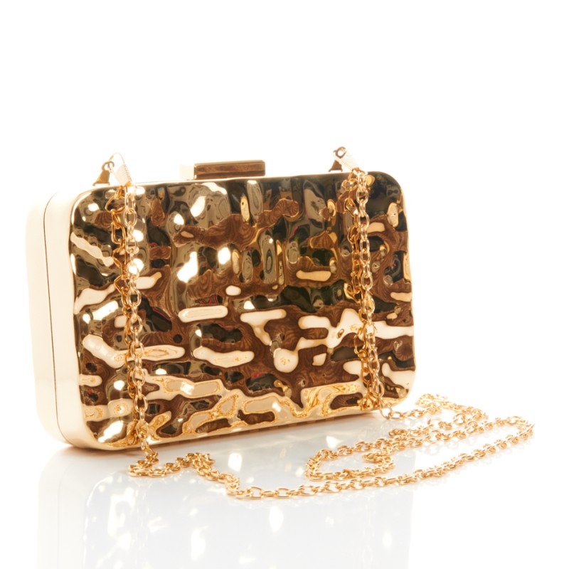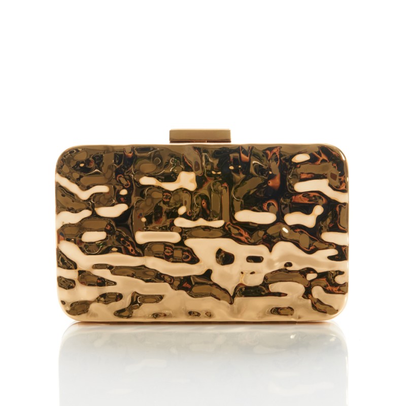 Cartera de metal en color dorado con forma rectangular.