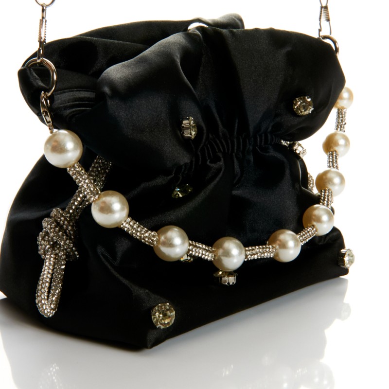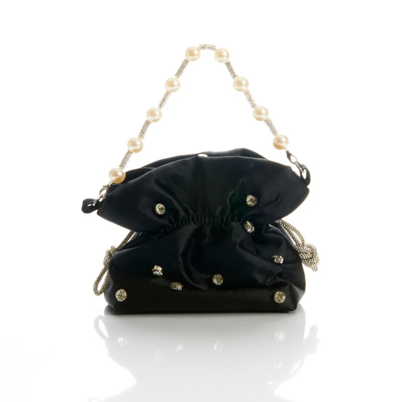 Cartera - bolso con forma de saquito y color satén negro. Asa corta.