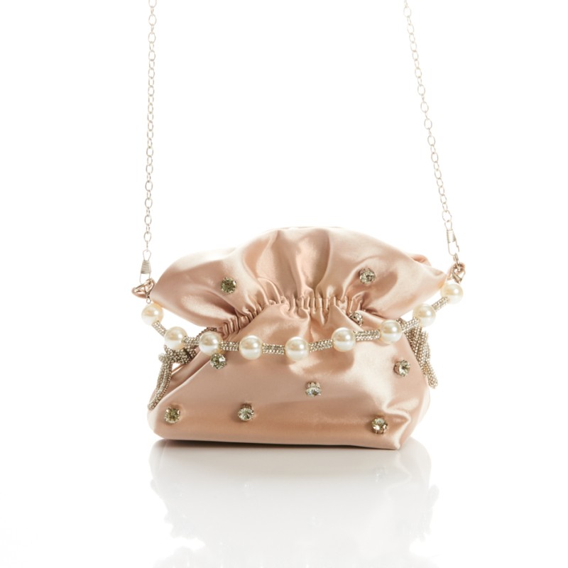 Cartera - bolso con forma de saquito y color satén beige. Asa corta.