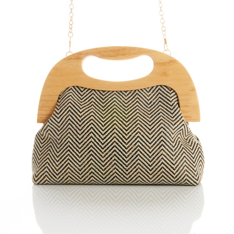 Cartera - clutch con forma cuadrada. Cierre en dos piezas de madera color clarito y tejido espiga.