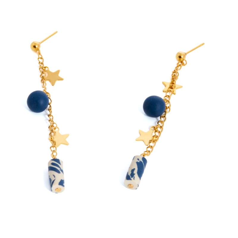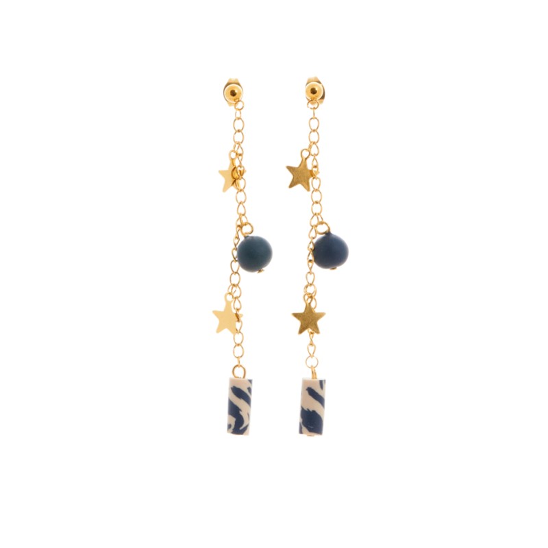 Pendiente Estelar. Inspirado en las estrellas, en la luz que aportan. Pendiente con base en forma de bolita mini y cadenita con charms estrellas y bolitas.
