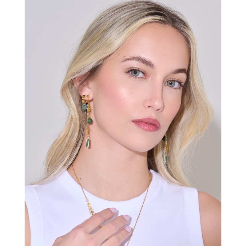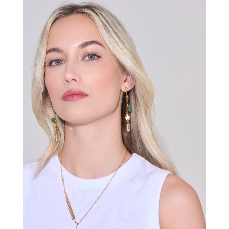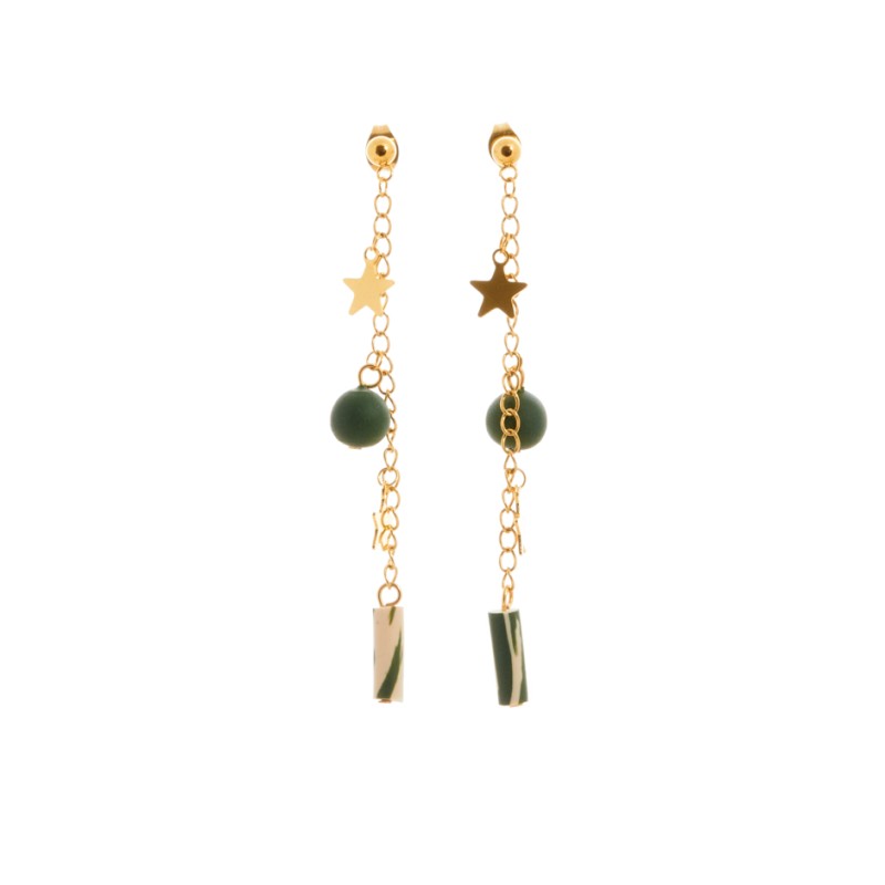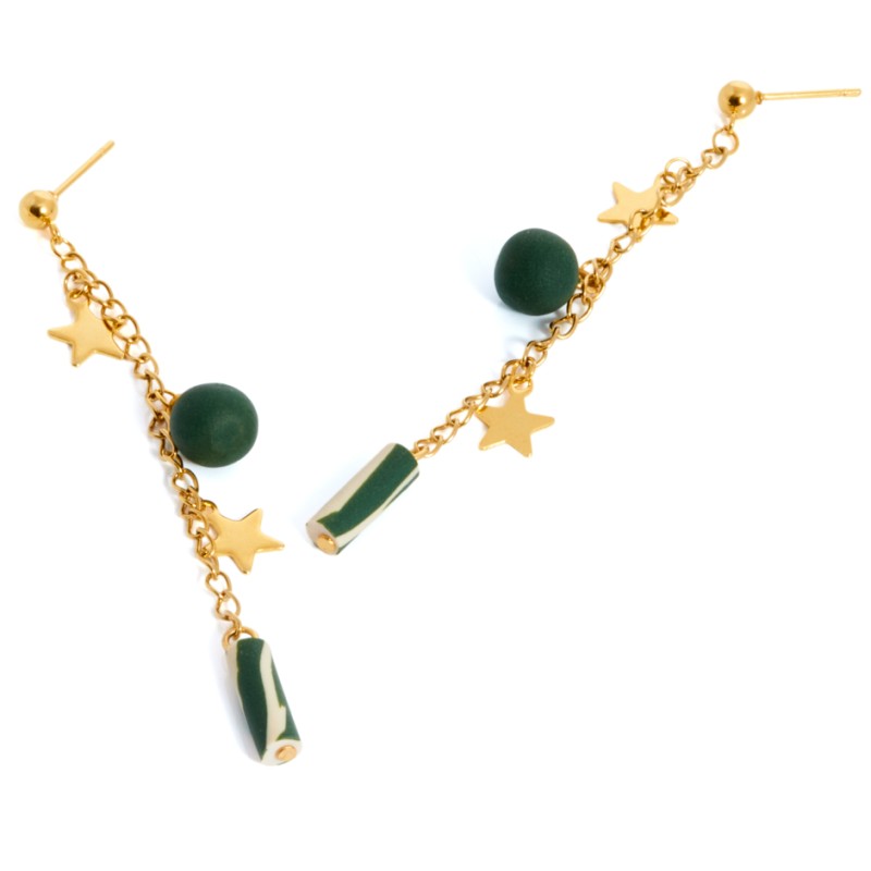 Pendiente Estelar. Inspirado en las estrellas, en la luz que aportan. Pendiente con base en forma de bolita mini y cadenita con charms estrellas y bolitas.