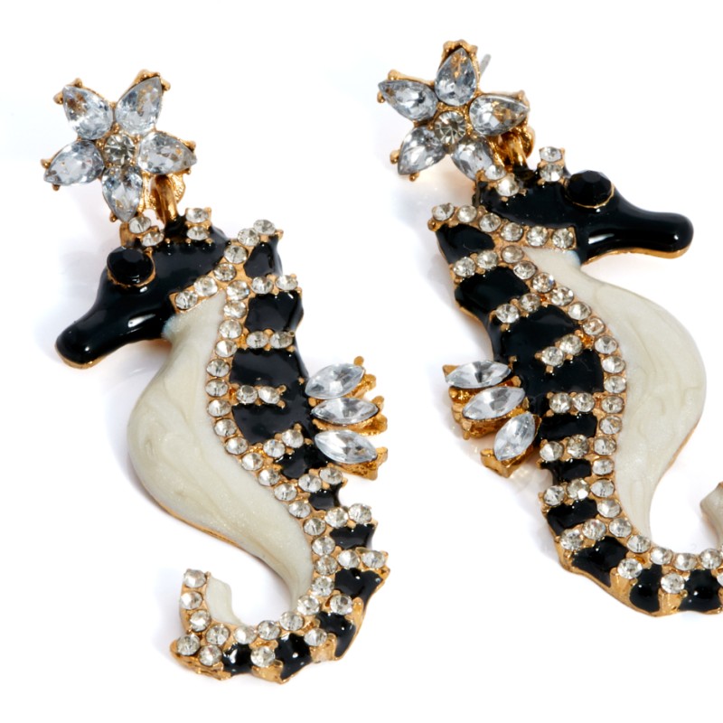 Pendiente con forma de caballito de mar esmaltado y con strass