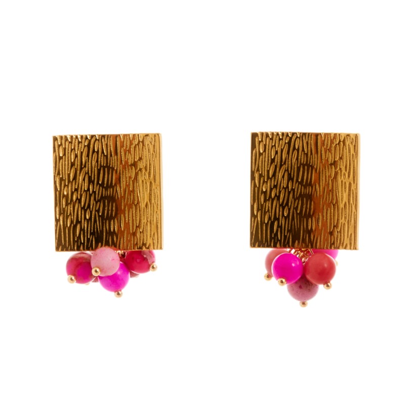 Pendiente con base cuadrada en dorado y superficie marcada y mini piedrecitas formando un racimo