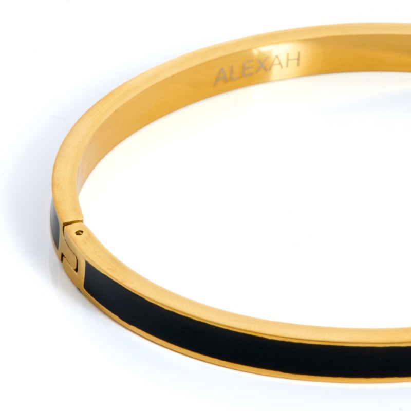 Brazalete de acero en color dorado. Superficie esmaltada en color negro brillo